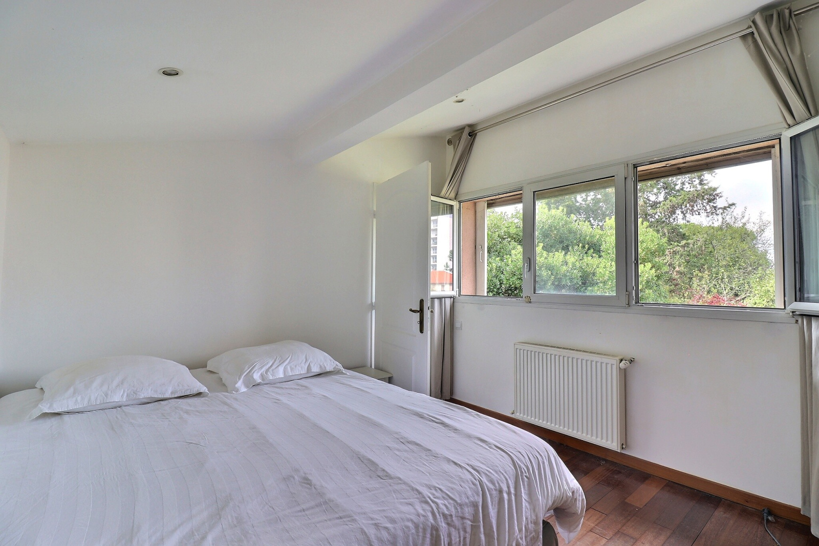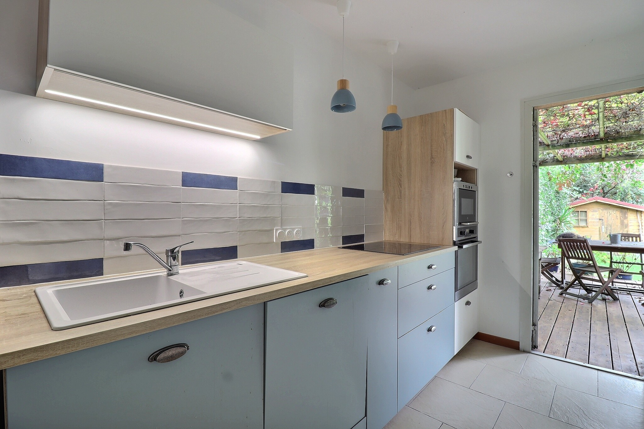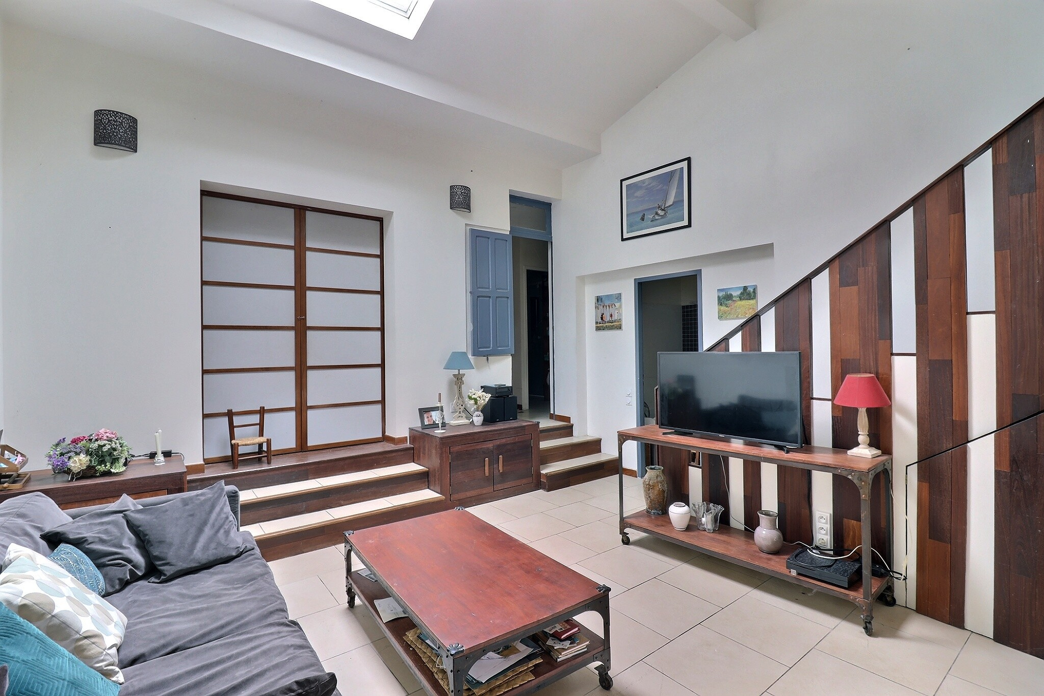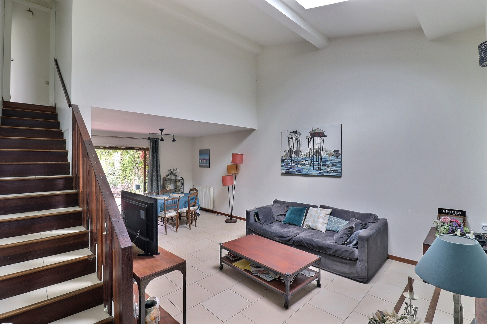 En rez-de-jardin : un salon avec une belle hauteur sous plafond, ouvert sur le jardin et donnant sur la cuisine, une chambre, ainsi qu'une salle de bain avec WC.